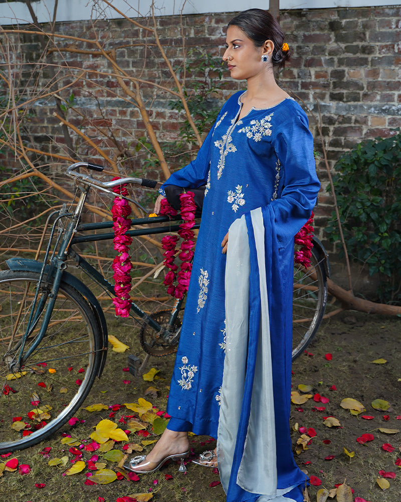 Be the talk of the town in this magnificent indigo ensemble featuring intricate embroidery and hand embellishments.