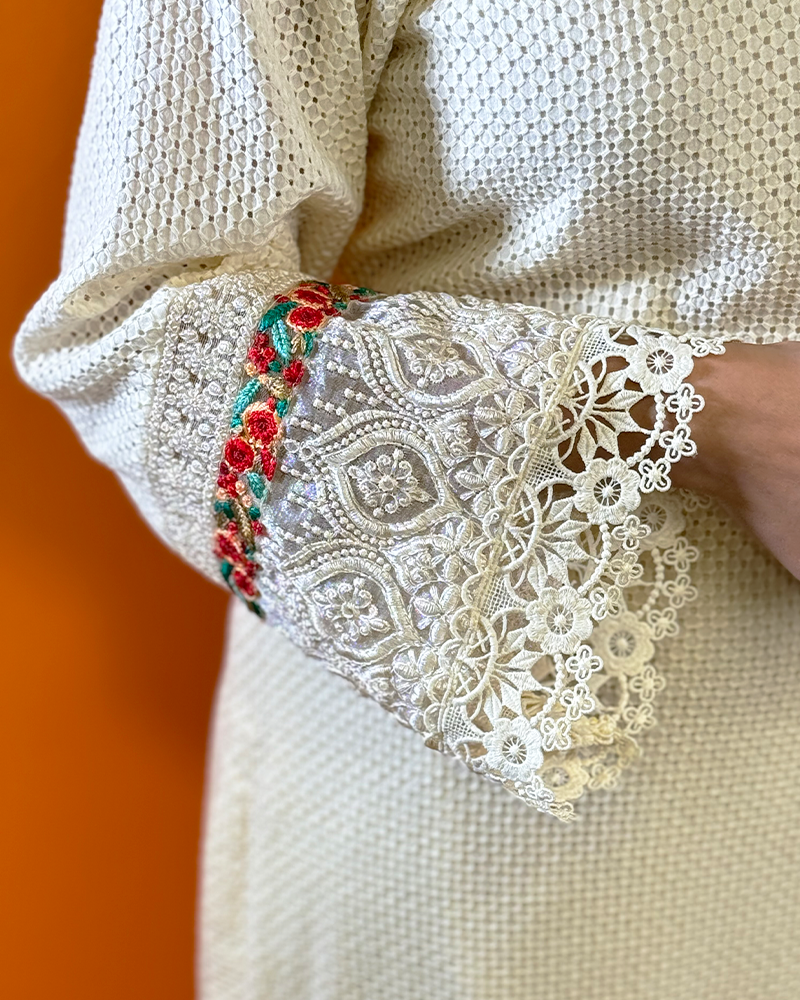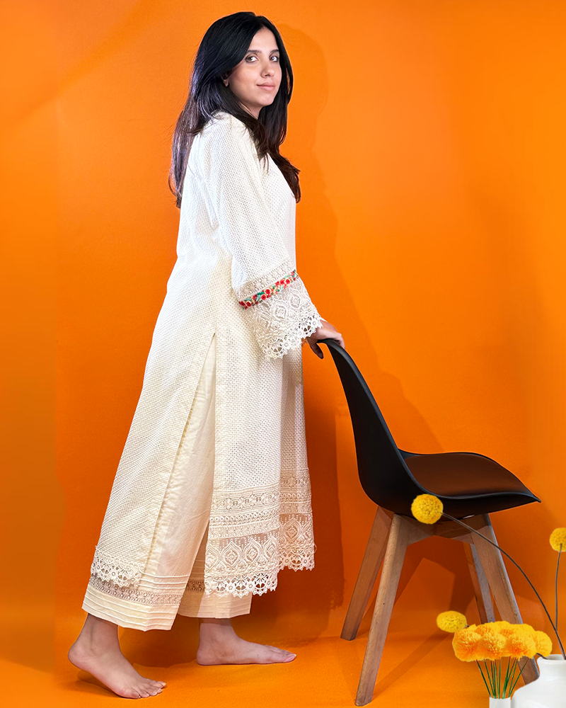 This is a 3 piece ensemble. Shirt is based on premium embroidered cotton fabric adorned with lace embellishments for an elegant look.