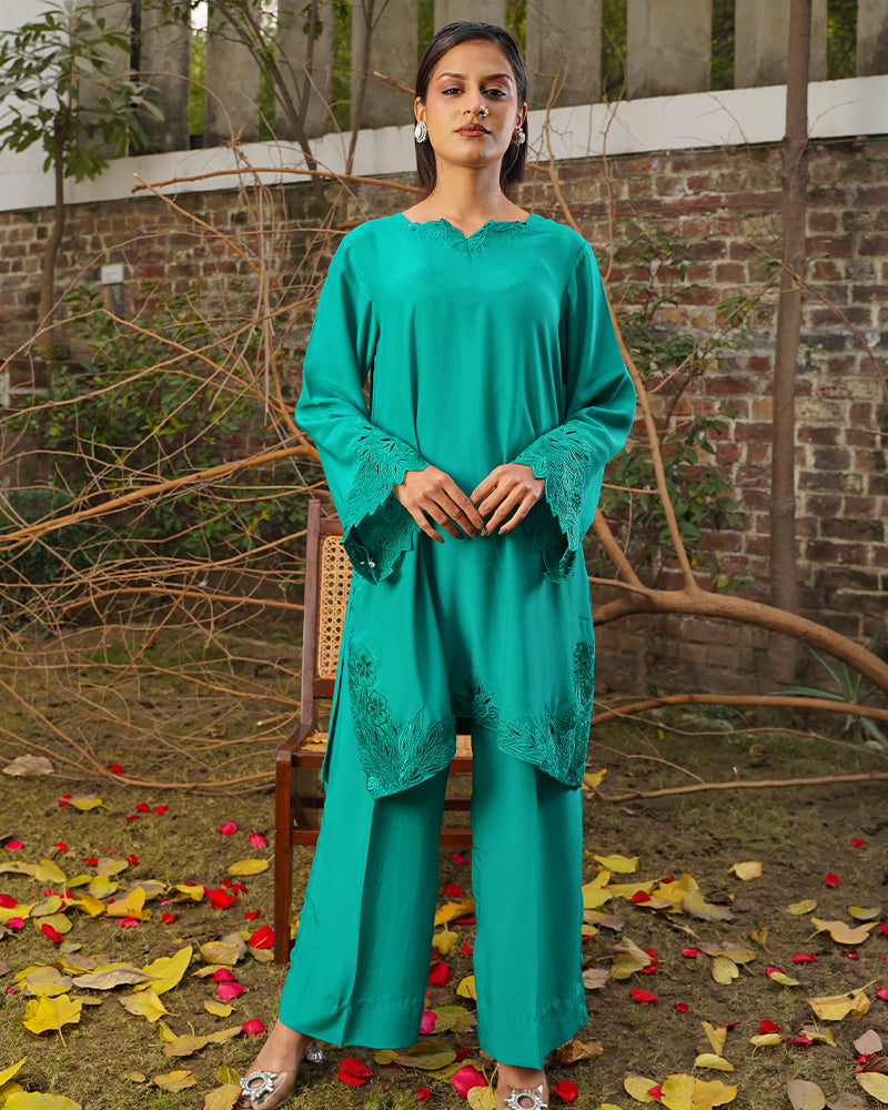 This ensemble is made in a vibrant emerald green hue embodying the perfect fusion of traditional cutwork with a modern cut.