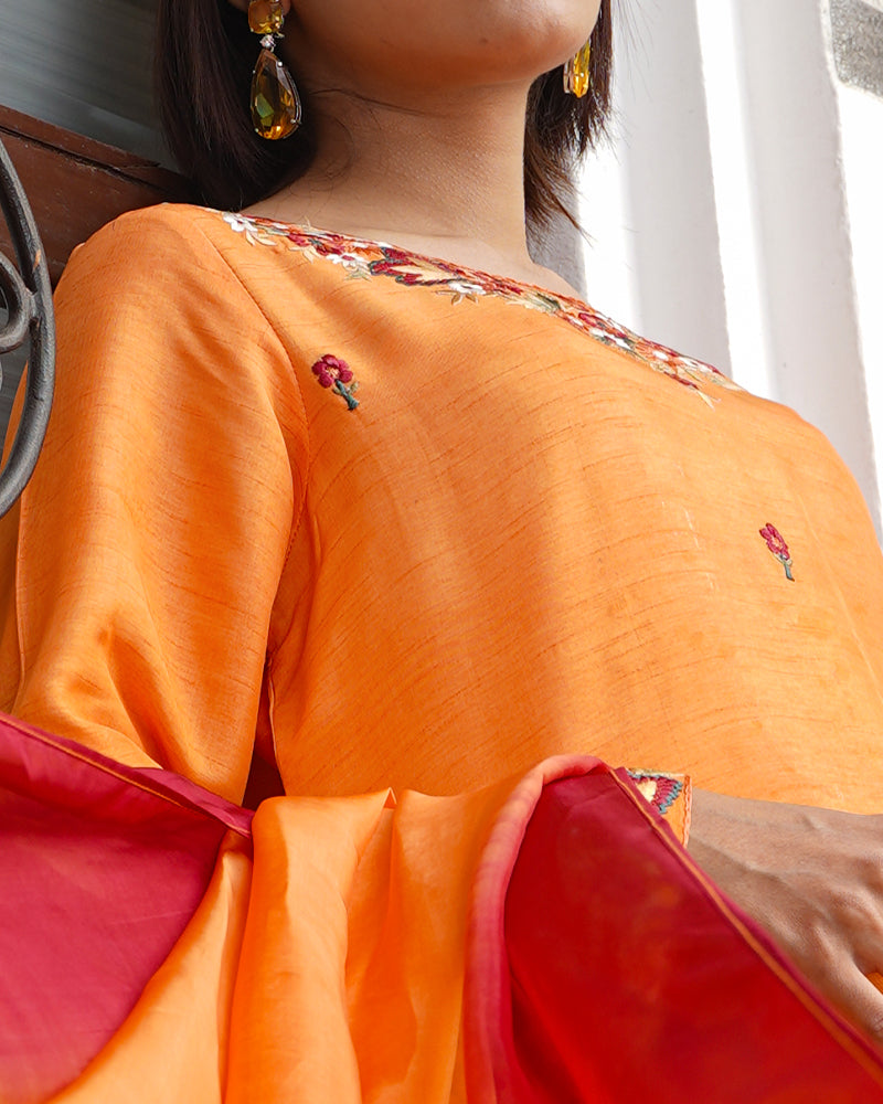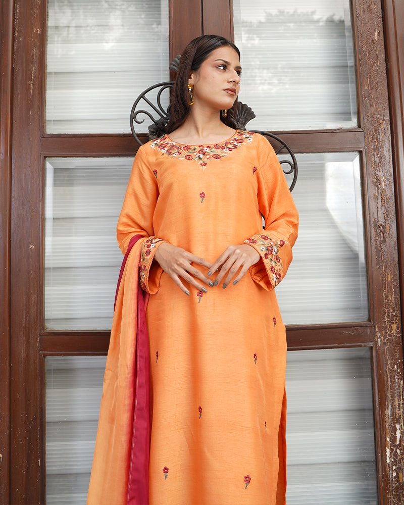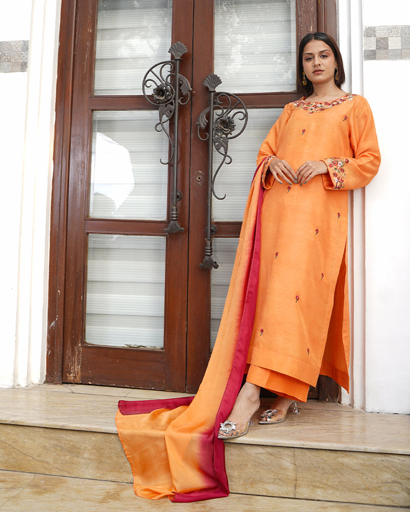 Feel vibrant and femine in this embroidered tangerine outfit to be the stunner in any event.